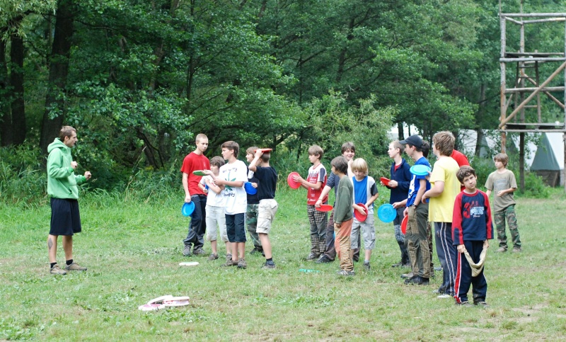 V pondělí 8. srpna vyrazili jsme já (Lucka), Miguel, Dixi a Boogie na skautský tábor v Huzové. Počasí nebylo ideální, ale pršet naštěstí začalo až při našem odjezdu. Miguel napřed klukům vykládal o ultimate frisbee a discgolfu, poté jsem řekla pár slov ještě o dogfrisbee a šli jsme házet. Po více či méně úspěšných pokusech naučit děcka backhand, forehand, over a scoober jsme si zahráli pár her v hodu diskem (discgolf, na přesnost, na dálku). Když už byli kluci utahaní a dlabali svačinu, předvedla jsem s Dixinkou dogfrisbee. Na závěr vyhlásil Miguel vítěze soutěží a přidal ještě pár otázek o ceny, abychom zjistili, jestli si skauti z našeho povídání něco zapamatovali :-)